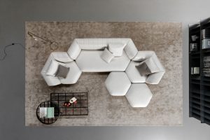 The heart of the collection is the hexagonal element, a versatile module that represents the very essence of the project. Designed to be used as a pouf or transformed into an armchair by adding armrests and a backrest, this component naturally integrates into various compositions, always creating new solutions: from a simple linear sofa to articulated and enveloping configurations.