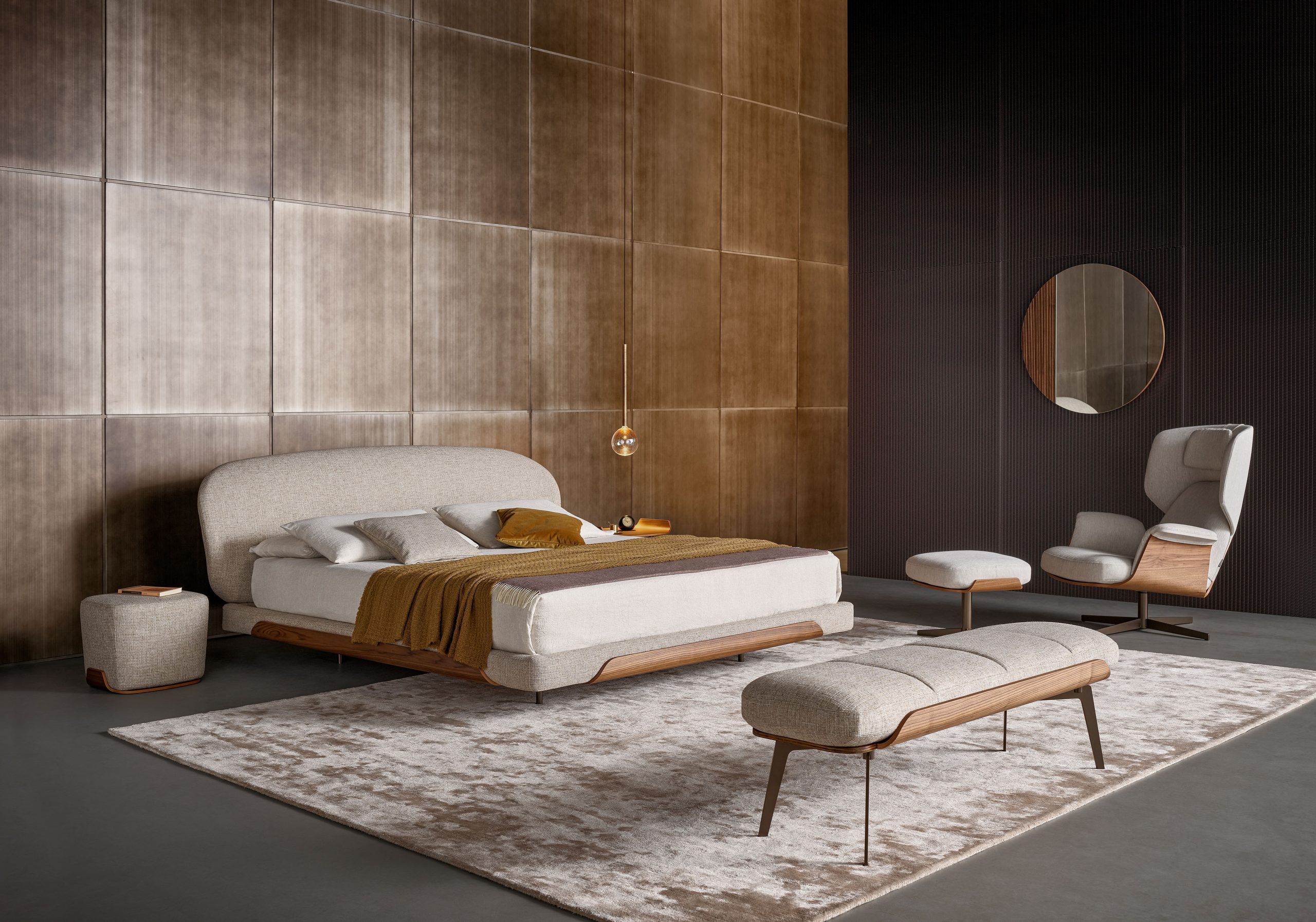 The star of the collection is Olos Bed, taking centre stage with its soft rounded lines combined with the pure shape of Olos Bedside Table, the generous padding of Olos Bench and Olos Pouf, which are perfect in the bedroom but also fit seamlessly into any room in the house.