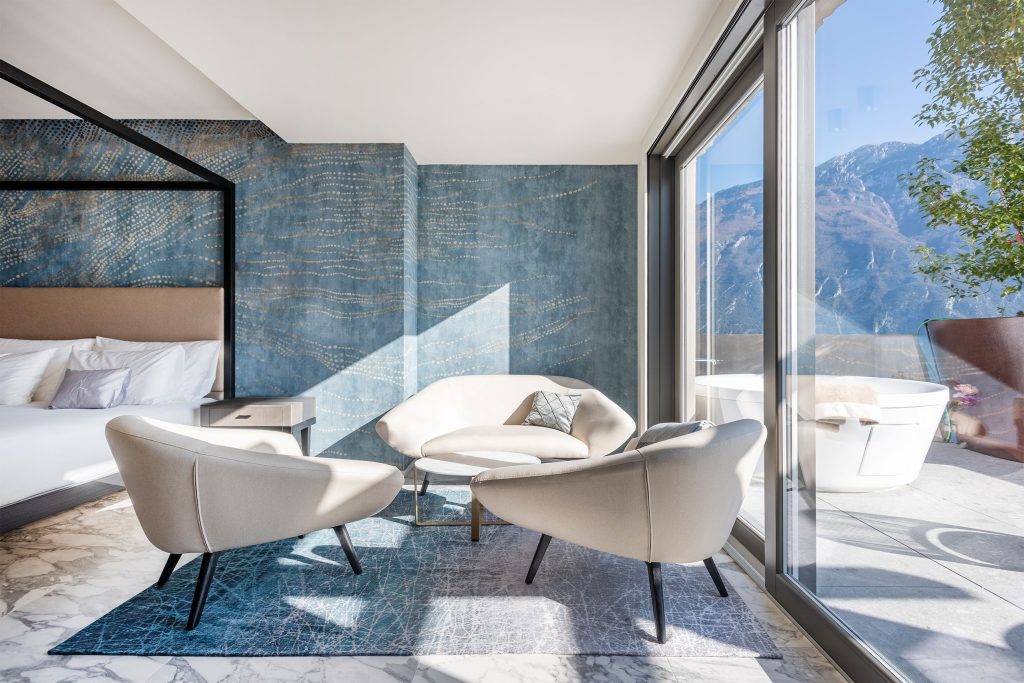 Overlooking Lake Garda, Eala Luxury Spa combines a focus on the uniqueness of its location with the desire to create spaces oriented towards the pursuit of all-round personal wellness. Designed by architect Marco Savorgnani of Studio Gesia, the spaces set aside for relaxation recall the iridescent atmospheres of the lake through dreamlike designs, while the suites are connected with the exteriors thanks to large windows and surfaces that evoke natural textures and colours. A strong stylistic and aesthetic continuity, in harmony with the spirit of the spa, crowned by the use of the Glamora wallcoverings.