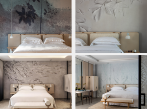 The resort’s rooms and suites are enhanced with Glamora wallcoverings, selected to highlight the theme of Mediterranean Roots, which is the thread running through the entire project. The Sensation, Dehors, Sovas, and Blur wall coverings adorn the walls behind the beds and in the living areas, conveying a sense of peace and sophistication. The natural motifs evoke light sea breezes and plays of light through leaves, while the neutral tones and soft textures blend perfectly with the minimalist furniture and the spectacular views of the Aegean Sea.