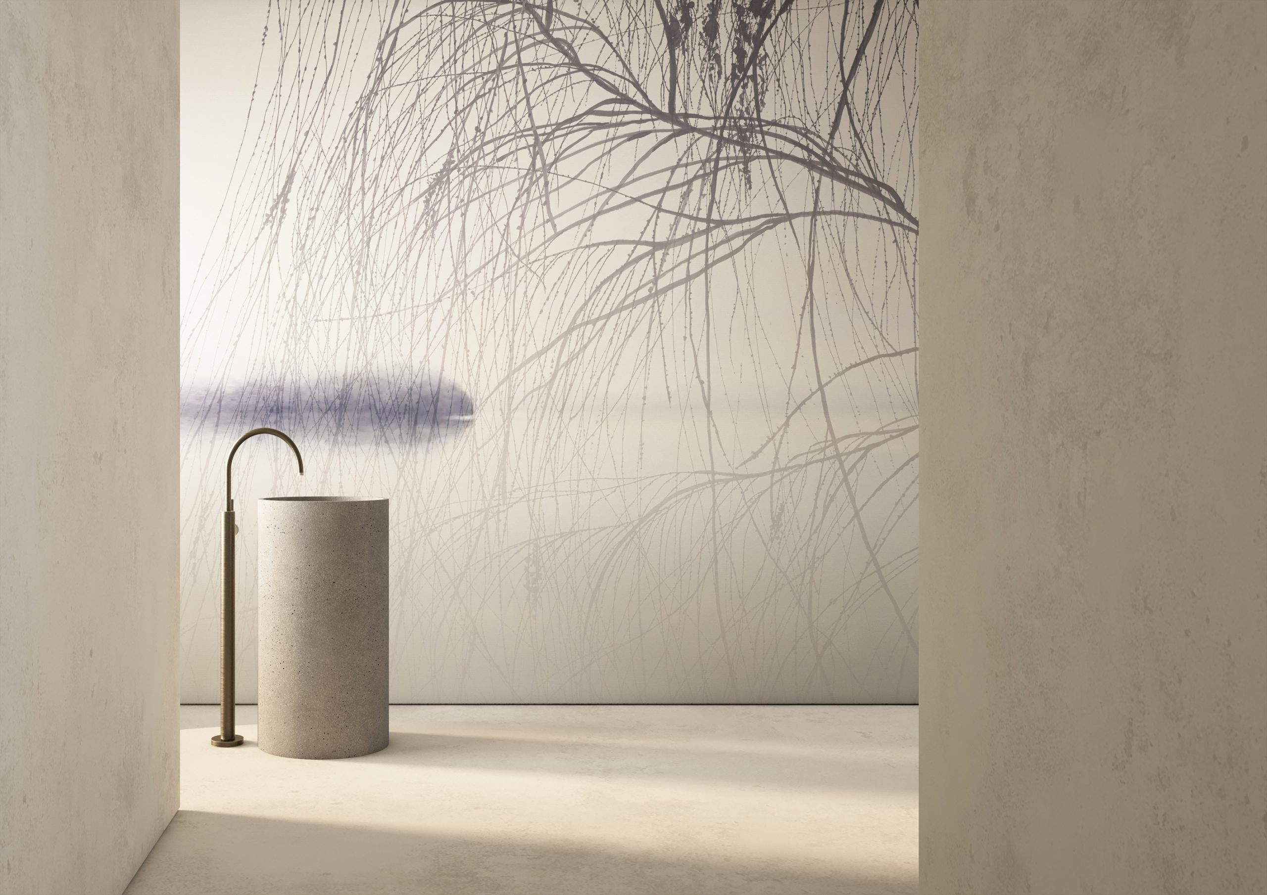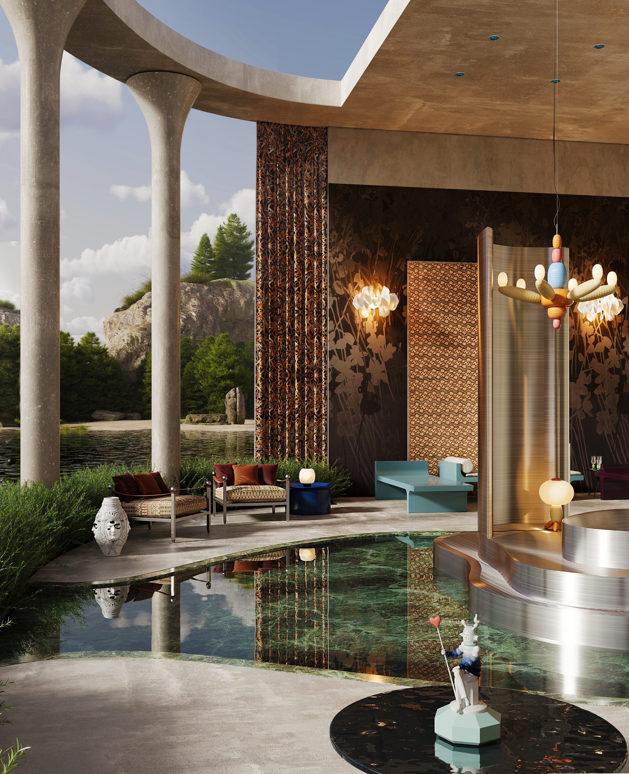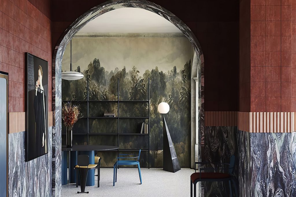 The Memphis flat in Milan is composed of spaces, furnishings and objects with a unique and experimental trait, which distances itself from contemporary minimalist aesthetics by offering an experience rich in formal and chromatic suggestions. Solid colours and geometric graphics characterise the walls, metal and plaster frames, carpets and curtains; while the furniture picks up on the primary colours and eclectic materials inspired by the Art Deco and Pop Art movements, revisited by the particular interpretation of the Italian collective founded by Ettore Sottsass. Creating a trait d’union between the different rooms is the landscape skyline of the Bellagio wallcovering applied along the walls of the living area. The material texture and soft tones in different shades of green emphasise the creative dimension of the spaces, characterised by large arches and bright windows, inviting guests to reconnect with nature.