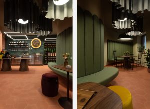 New Life’s work is equally evident in the tables, which are custom-made based on catalogue models and crafted from a noble wood, walnut, chosen for its material value but also for its connection with the culinary specialities that distinguish L’Antica Ricetta. The I-Conico model has been reinterpreted in two versions, and the Flo tables, also made with custom-made walnut tops, have been developed in two different sizes. The space is completed by antique chairs salvaged from the building, which bring authentic traces of the place’s history into the present, and velvet-covered poufs from the And Seat System collection, which add a soft, contemporary touch.