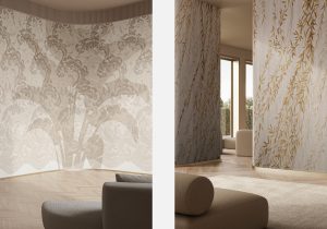 In Glamora wallcoverings, the surface engages with light and pattern through nature inspired motifs, satin and reflective finishes, and subtle plays of light and shadow.
